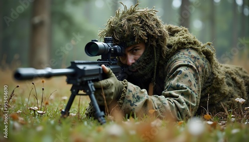 Stealthy Aim Sniper in a Camouflaged Position Ready to Take the Shot