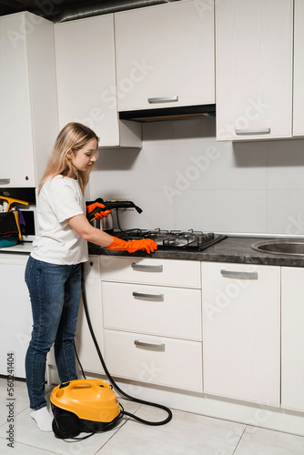 Steam cleaning of kitchen using professional steam generator. Woman cleaner is steaming and disinfecting cooker in kitchen. Girl worker of domestic cleaning service clean using vapour machine.