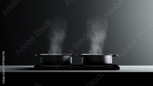 Steam rises from cooking pots on a modern stovetop in a sleek kitchen setting