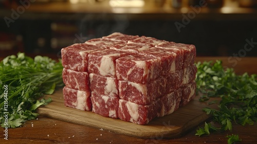 Steaming beef cubes, restaurant kitchen, parsley garnish, food advertisement