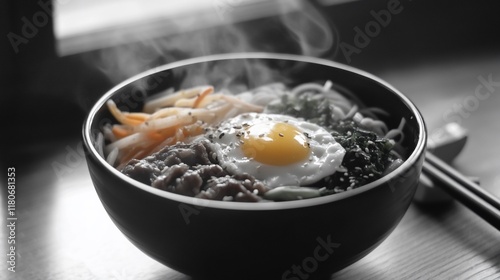 Steaming bowl of bibimbap with fried egg, vegetables, and meat.