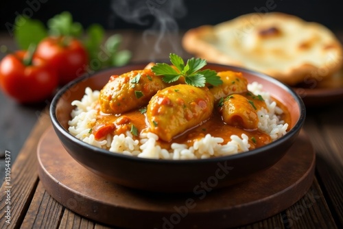 Steaming bowl of chicken curry with fluffy rice and naan bread on the side , flavorful sauce, savory dish