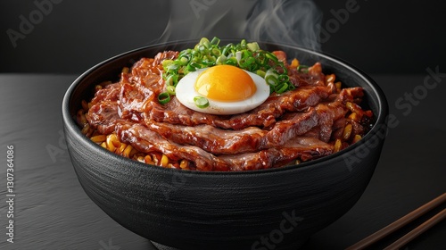 Steaming Bowl of Delicious Beef with Egg and Green Onions