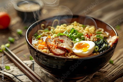 Steaming Bowl of Ramen with Pork Egg and Vegetables on Rustic Wooden Table