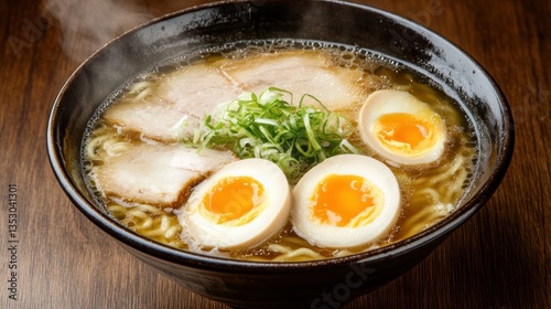 Steaming Bowl of Ramen with SoftBoiled Eggs and Chopped Scallions Perfect for Culinary and Fo