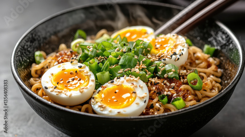 steaming bowl of spicy ramen topped with soft boiled eggs and green onions, garnished with