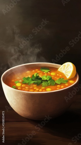 Steaming bowl of vibrant lentil soup garnished with fresh herbs and lemon slice