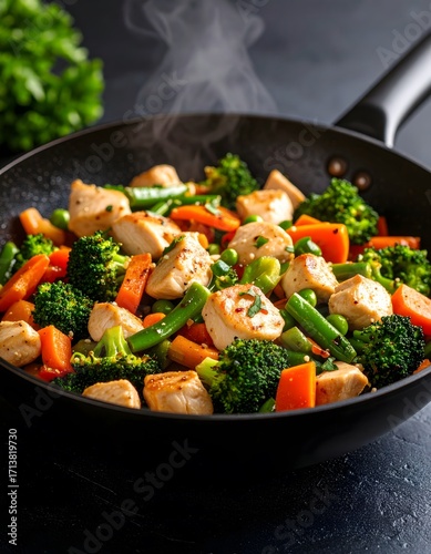 Steaming Chicken Stir-Fry: Vibrant Broccoli, Carrots, and Green Beans in a Black Pan