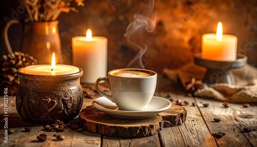 Steaming coffee cup amidst candles and rustic wood, creating a warm, cozy atmosphere