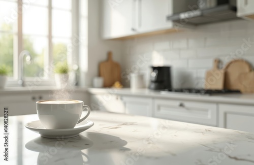 Steaming coffee cup on marble surface in bright kitchen. Sunlight streams, highlighting fresh aroma. Warm beverage on white mug, cozy home interior design. Morning wake up with drink.