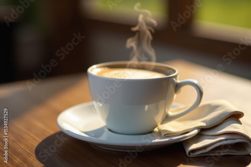 Steaming coffee in white mug, folded napkin beside , aroma, cappuccino, cafe
