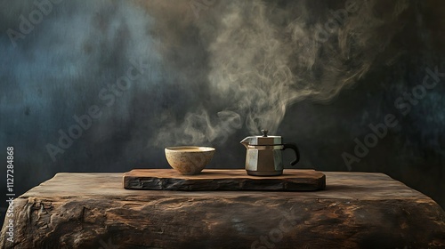 Steaming Coffee Percolator and Bowl on Rustic Wood