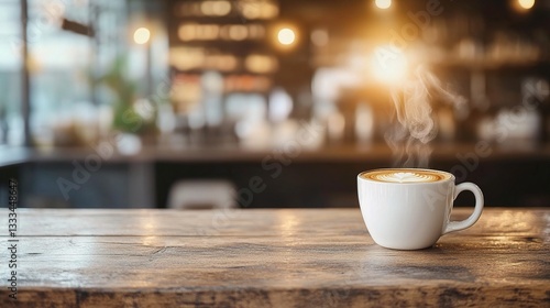 Steaming Cup of Coffee on Rustic Wooden Table in Cozy Cafe Environment