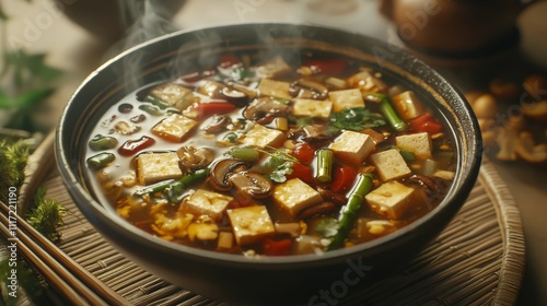 Steaming Hot and Sour Soup with Tofu Mushrooms Bamboo Shoots