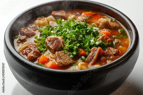 Steaming hot bowl of hearty beef soup with noodles and fresh herbs