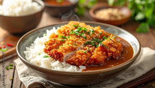 Steaming hot bowl of traditional Japanese Katsu Curry with a crispy breaded cutlet served over fluffy white rice on a rustic wooden table