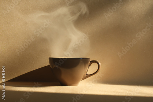 Steaming Hot Brown Cup of Coffee or Tea on a Beige Surface with Soft Shadows Creating a Cozy and Warm Morning Vibe Simple Still Life