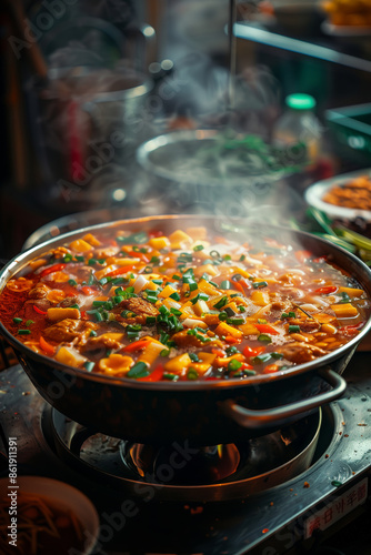 Steaming Hot Pot With Meat and Vegetables on a Stovetop