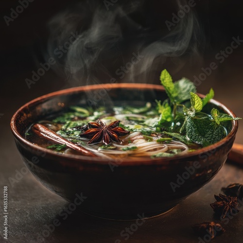 Steaming noodle soup, dark wood background, culinary photography, food blog use