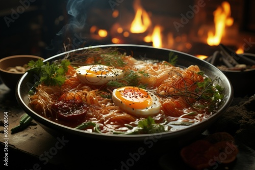 Steaming Noodle Soup: Hot ramen bowl, soft-boiled egg, aromatic delight, traditional cuisine, culinary warmth, comfort food.