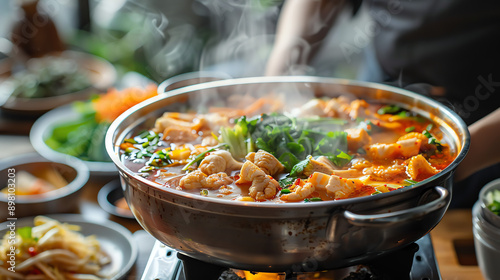 Steaming Pot of Spicy Korean Stew With Chicken and Vegetables