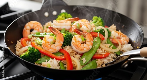 Steaming shrimp stir-fry showcasing vibrant colors and culinary freshness