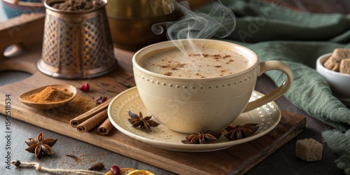 Steaming Spiced Latte Close-up Composition, Warm Tones, Aromatic Beverage, Cinnamon, Star Anise, Coffee, Cozy Spiced Latte