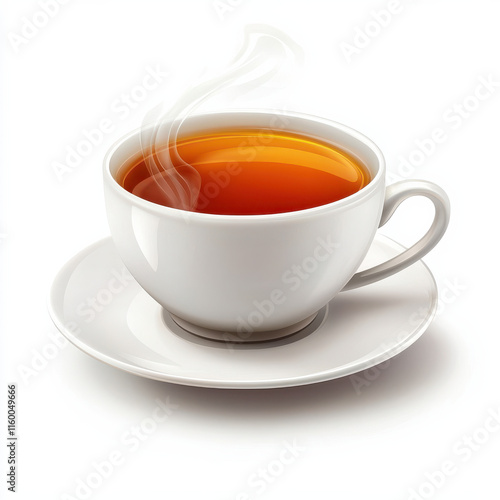 Steaming tea cup on saucer, warm and inviting isolated design on white background