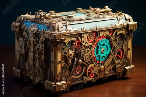 Steampunk mechanical chest featuring glowing gears and intricate ornate details