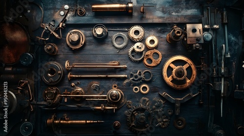 Steampunk workshop gears intricate machinery vintage industrial brass instruments heavy textures