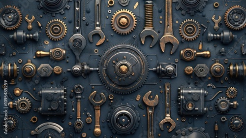 Steampunk-style arrangement of metallic tools and gears on dark background.