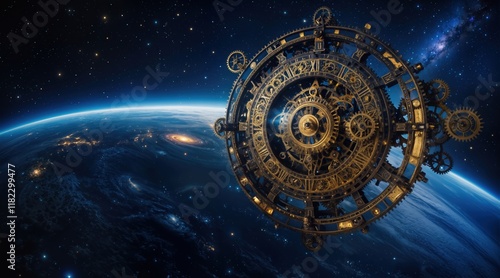 Steampunk-Style Orbital Machine Floating Above Earth in Outer Space