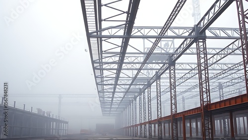 Steel beams rise through morning fog at a construction site, creating a striking diagonal composition.