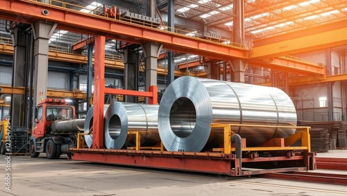 Steel coil being transported in industrial plant, factory logistics, industrial storage
