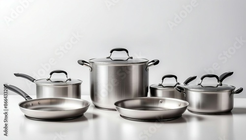 steel cookware and pan on white background, copy space for text, ad shot.