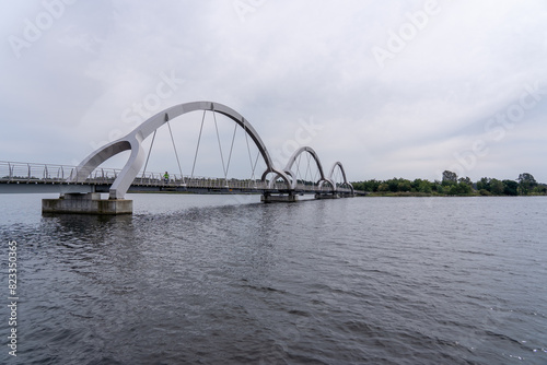 Steel rail bridge crossing waterway, Sweden, Soelvesborg