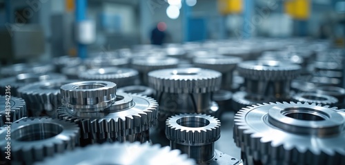 Steel turbine parts in factory. Metalworking machining, manufacturing. Precision engineering, mechanical industry production processes. Metallic gear components. Industrial machinery. Production line.