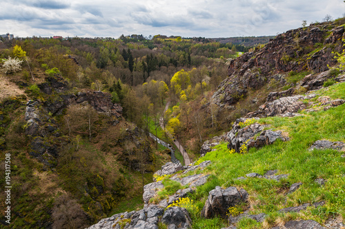 Steep rocks and valley Divoka Sarka in Prague, spring time. Wild nature park in the city.