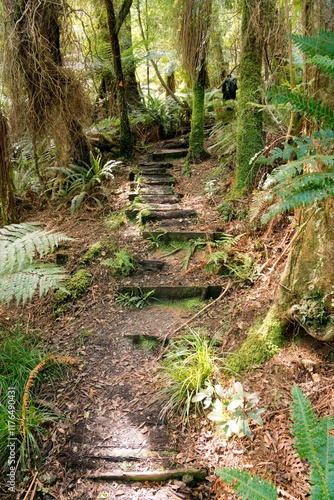 Steep Upward Hiking Path in New Zealand's Deep Forest