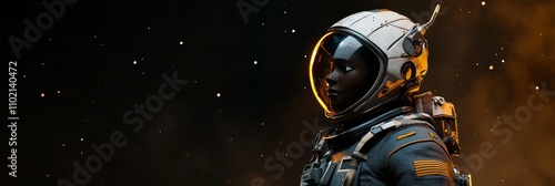 Stellar Voyager: A Black Astronaut in Space - A stylized black astronaut, facing right, stands against a dark, starry backdrop, symbolizing exploration, courage, diversity, the cosmos, and future tech