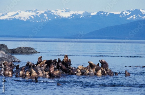 Steller Sea Lion, eumetopias jubata, Group standing on Rocks, Alaska