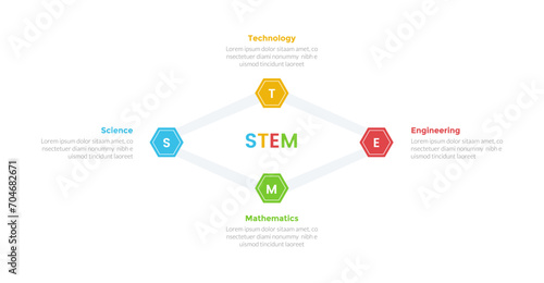 STEM education infographics template diagram with hexagonal or hexagon line connected with 4 point step design for slide presentation
