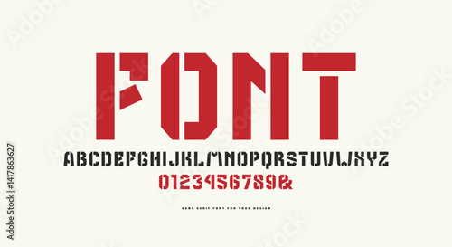 Stencil-plate sans serif font in the military style. Letters and numbers for logo and emblem design. Color print on white background