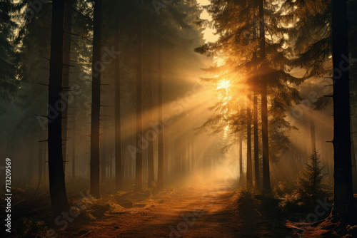 Step into a tranquil woodland setting with green trees and sun-dappled forest floor capturing the serene and peaceful ambiance of a summer day. AI generative.