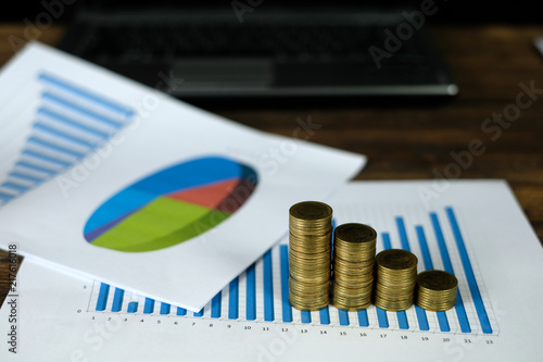 Step of coins stacks with notebook laptop computer and financial graph on white paper on working table, business planning vision and finance analysis concept.