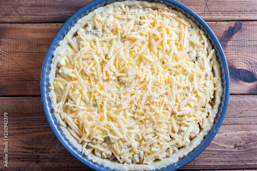 Step-by-step cooking of an open pie with mushrooms and chicken, step - cooking the filling, selective focus