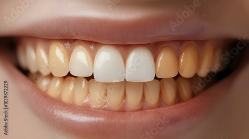 Step-by-step guide to teeth whitening in infographic form, featuring clear transformation images of teeth from yellow to white, Photorealistic Style, Neutral Background