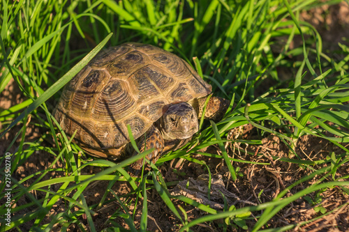 Steppe turtle crawling in the grass.