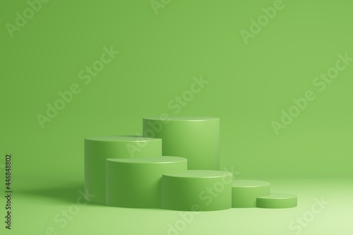 Stepped pedestal of six green cylinders in studio lighting on green background. 3d render.