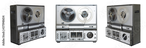 Stereo tape deck recorder player with reels on background.